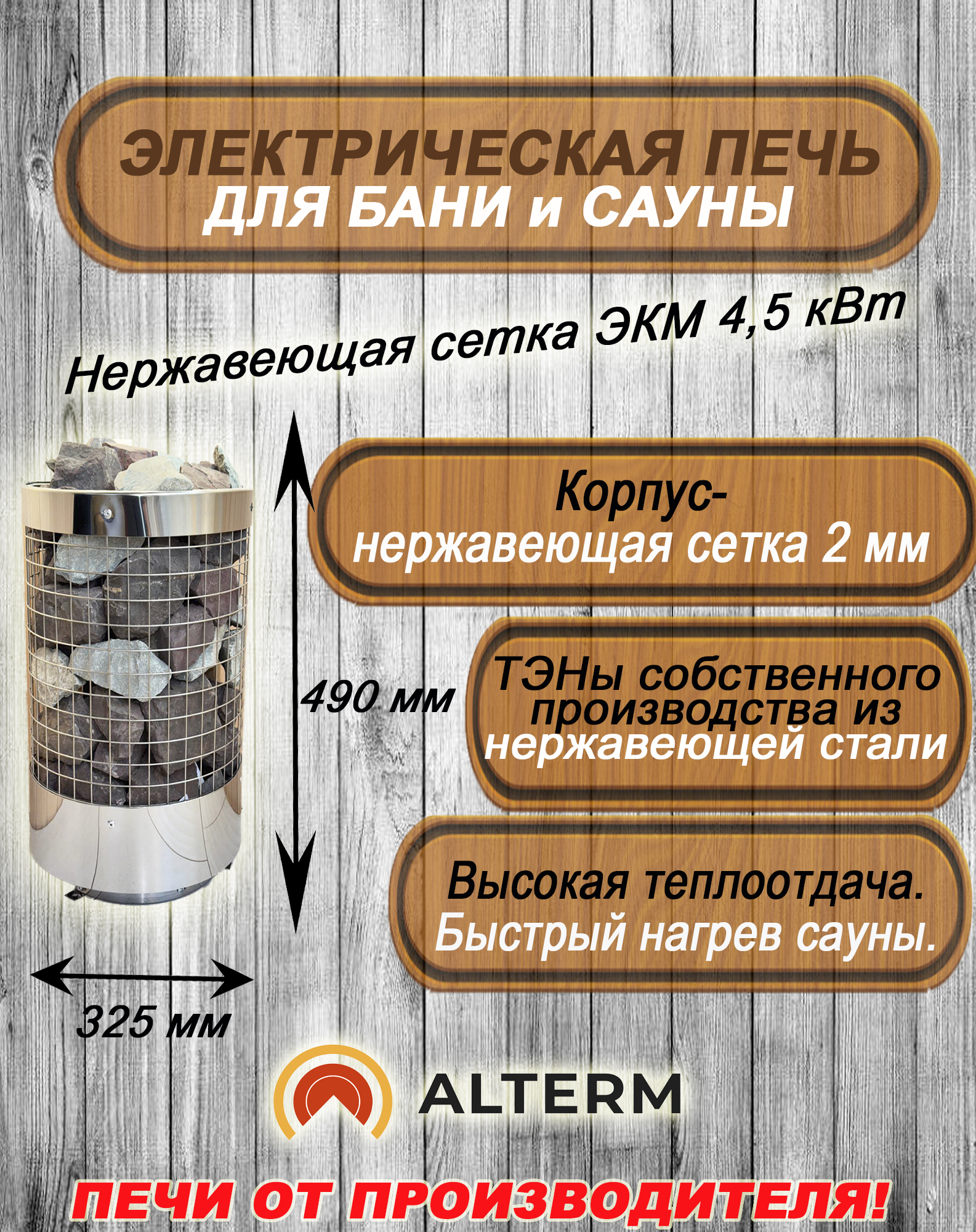 - корпус электрокаменки выполнен из НАСТОЯЩЕЙ КОРРОЗИОННОСТОЙКОЙ НЕРЖАВЕЮЩЕЙ СТАЛИ. Он не поддается коррозии и даже через 5 лет сохранит привлекательный вид без налетов ржавчины.